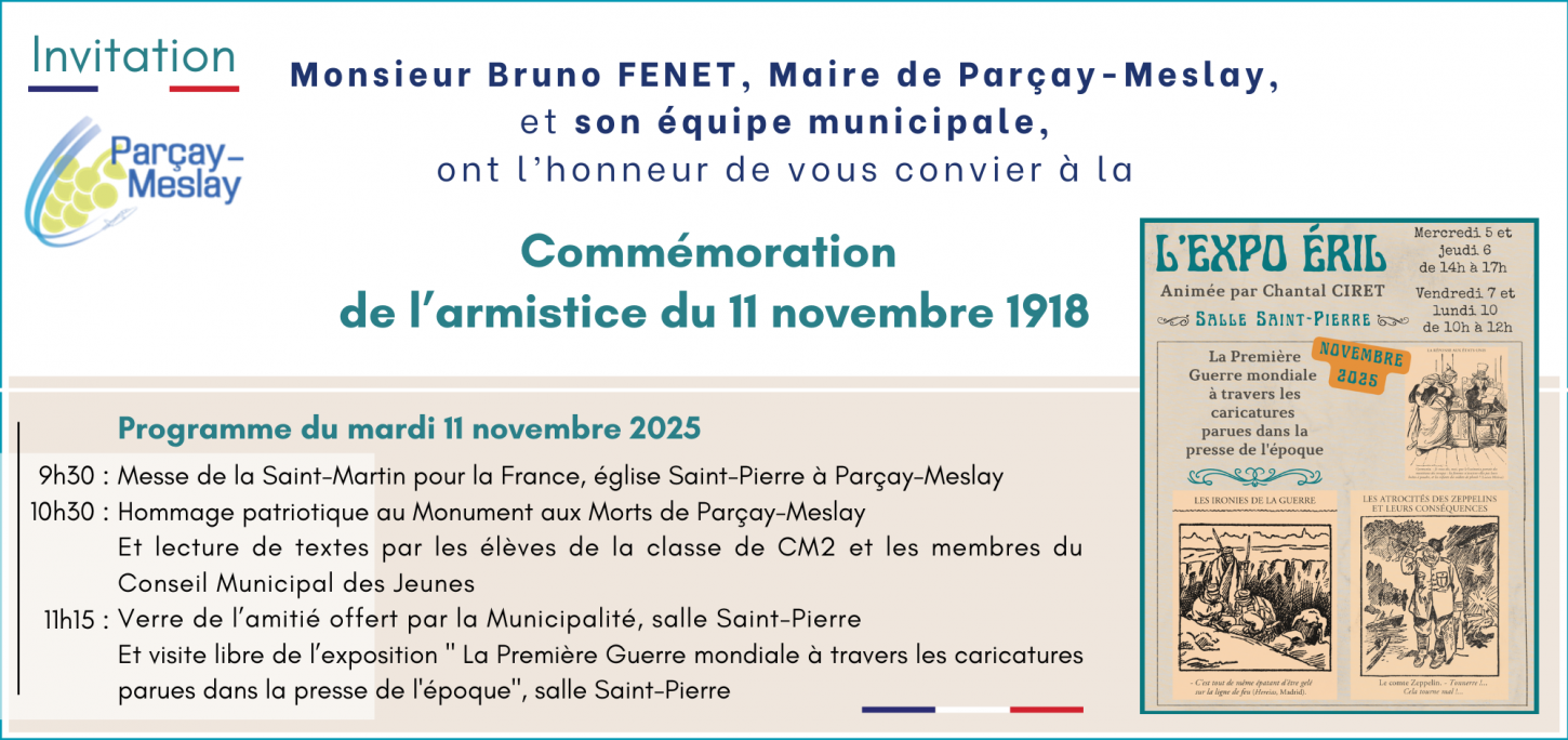 Nous avons le plaisir de vous convier à la Cérémonie commémorative de l'armistice du 11 novembre 1918, qui se déroulera le mardi 11 novembre 2025 à 10h30, au Monument aux Morts de Parçay-Meslay, en présence des enfants du Conseil municipal des jeunes, des enfants du CM2 et de l’Harmonie musicale de Parçay-Meslay.