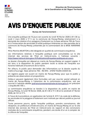 Une enquête publique de 15 jours est ouverte du lundi 16 février 2026 à 8 h 30 au lundi 2 mars 2026 à 17 h sur la commune de Parçay-Meslay relativement à la demande de création d’un polygone d’isolement sur la base aérienne 705 de Tours et à l’instauration de servitudes d’utilité publique inhérentes sur des parcelles de la commune de Parçay-Meslay présentée par le commandant de la BASE AERIENNE 705.