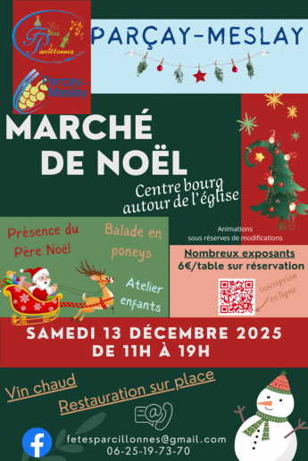 Venez découvrir la magie de Noël au Marché de Noël de Parçay-Meslay, un événement incontournable pour petits et grands ! Vous y trouverez de nombreux exposants, offrant une sélection de produits artisanaux, décorations, gourmandises et idées cadeaux pour célébrer les fêtes de fin d’année.