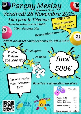 D'autre part, une page de collecte officielle animation Téléthon 2025 de Parçay-Meslay est à votre disposition pour les dons en ligne sur : https://mapage.telethon.fr/animation/Parcay-Meslay-Telethon (par cette page, le don se fait directement auprès de l'AFM-Téléthon. Votre don sera aussi comptabilisé dans le montant récolté pour Parçay-Meslay).