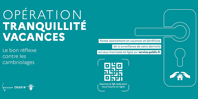 Pendant toute absence prolongée de votre domicile, vous pouvez vous inscrire à l'opération tranquillité vacances. Les services de police ou de gendarmerie se chargent alors de surveiller votre logement. Des patrouilles sont organisées pour passer aux abords de votre domicile. Vous serez prévenu(e) en cas d'anomalies (dégradations, cambriolage, ...).